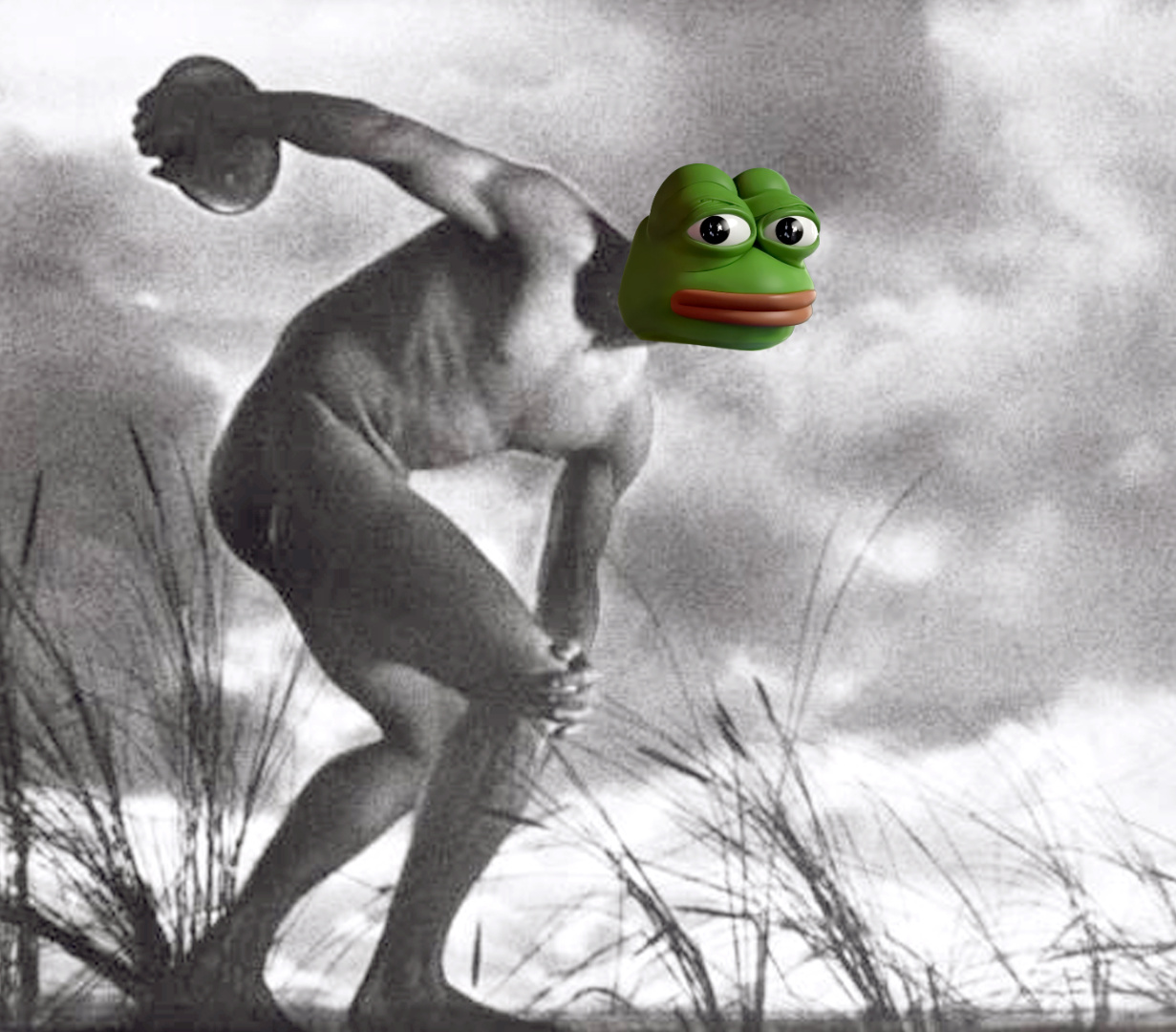 “I just want to thank everybody. And, in particular, god.“ collagiert Leni-Riefenstahl-LowRes mit einem KI-generierten Bild von “Pepe der Frosch” (Prompt bei Crayon.com: “3D-Animation of Pepe the Frog looking into the camera”). “Pepe der Frosch” ist ursprünglich eine vom Comiczeichner Matt Furie erschaffene (liebenswerte und freundliche) Figur, die von der Alt-Right-Bewegung im US-Wahlkampf 2026 und später u.a. von der rechtsextremen Identitären Bewegung gekapert und als Internetmeme mit rechtsradikaler Bedeutung aufgeladen wurde. Die Figur wird seitdem ambivalent gelesen. Titel: “I just want to thank everybody. And, in particular, god. I want to just say, we love you, God, and we love our great military.“ waren die Worte von US-Potus D. Trump während seines öffentlichen Presseauftritts nach den US-Angriffen auf den Iran im Juni 2025. Auflage: 20012025 ist das Datum des Amtsantritts D. Trumps zu seiner 2. Amtszeit. Kunstmarkt-Konzept: Verkauf nur nach Spende 100,-€ an correctiv.org oder wikipedia.de. Das Foto entstand ca. 1936 während der Filmaufnahmen zum Prolog des ersten Teils des von Riefenstahl inszenierten Propagandafilms „Olympia“, der anlässlich der Olympischen Spiele 1936 in Berlin von Leni Riefenstahl für die damalige nationalsozialistische Regierung ausgeführt wurde. Der Prolog zum ersten Teil des Films, „Fest der Völker“, wurde von Willy Zielke, Mitglied des Kamerateams von Riefenstahl, als Autor, Regisseur und Kameramann ohne Beteiligung von Riefenstahl gedreht. (Nicht zu verwechseln mit dem Foto „Der Diskuswerfer, 1936, Leni Riefenstahl)