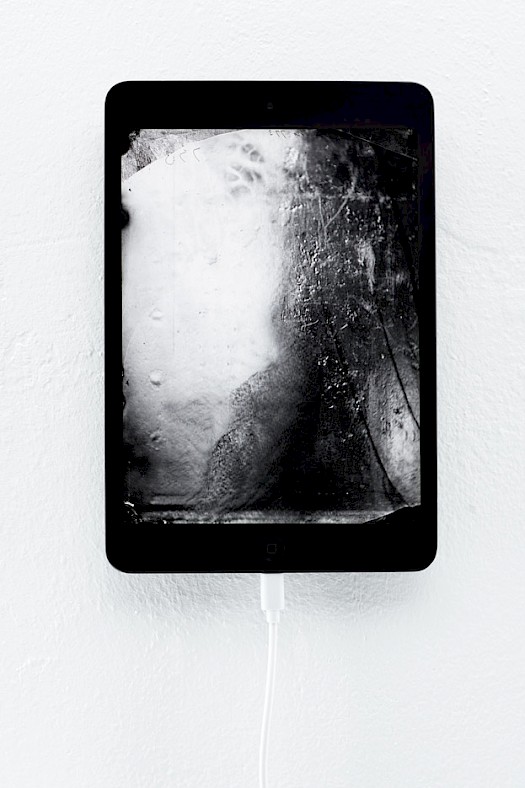 Works 18/, 2020: For the Roland Barthes_AI series, I worked with images from Roland Barthes' famous 1980 book "Camera Lucida". I edited the digitised images on an iPhone using a simple consumer AI app available on the market. The app uses image recognition to identify people and automatically retouches them from the image with a single click. The resulting images are loaded onto a tablet and displayed on the screen.