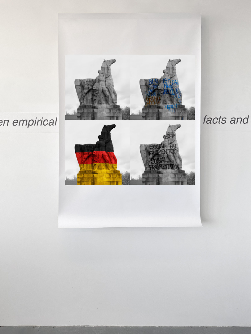 Installation view, detail: 2026, ca. 2 x 15 m, Sublimationsdruck auf Mesh-Plane, Sublimationsdruck auf PVC-Plane, Inkjet print (Hahnemühle Photo Silk Baryta X) in Aluminium Rahmen, (abgebildete Plane: 150 x 100 cm)