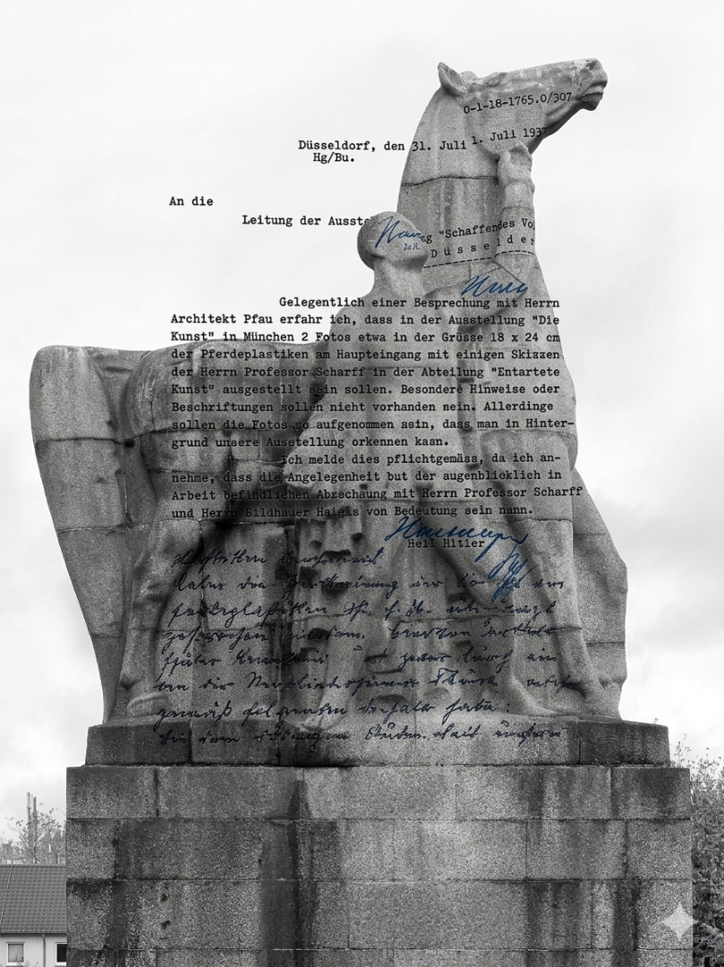 Arbeitsprozess: Überlagerung eines von mir im Jahr 2025 erstellten Fotos der "Rossebändiger" mit Archivmaterial aus dem Stadtarchiv Düsseldorf aus dem Jahr 1937 (bzgl. temporärem Erscheinen zweier Fotos der "Rossebändiger in der Ausstellung "Entartete Kunst" 1937) mithilfe von KI und digitaler Bildbearbeitung.